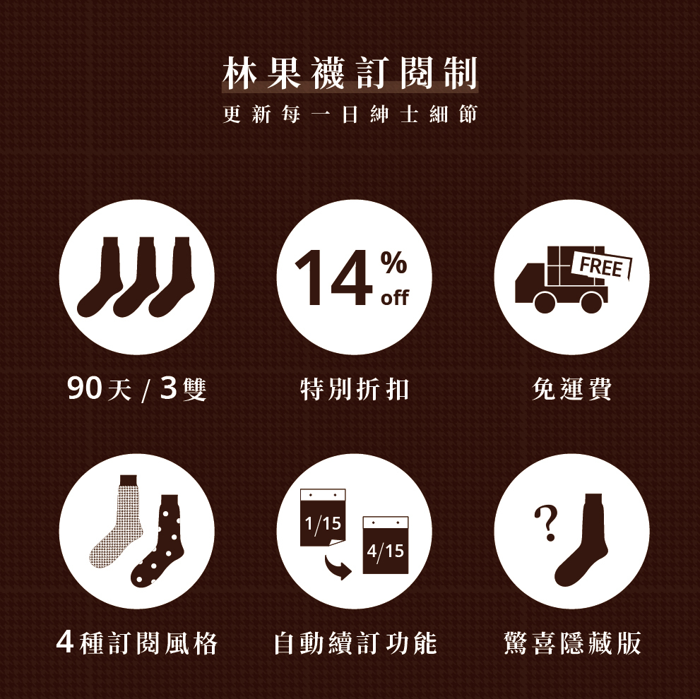 提供搭配皮鞋的更多可能性,讓男士利用襪子也能展現個性。透過林果的好品味與台灣製造的好品質,讓你更新紳士細節,在好感度及專業度加分。從日常生活上的細節、穿搭的風格、喜好的興趣等,讓林果更加了解你,挑選出最適合你的組合。