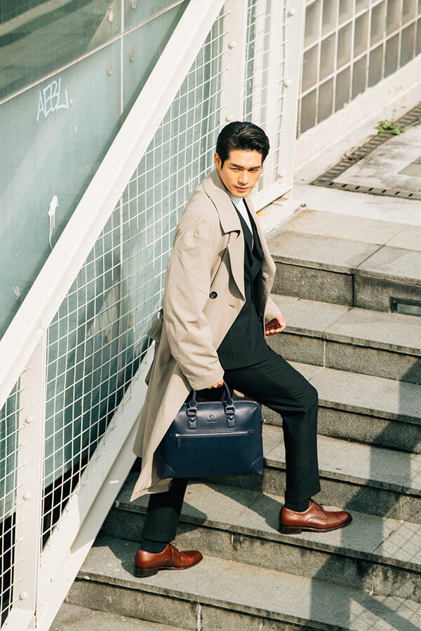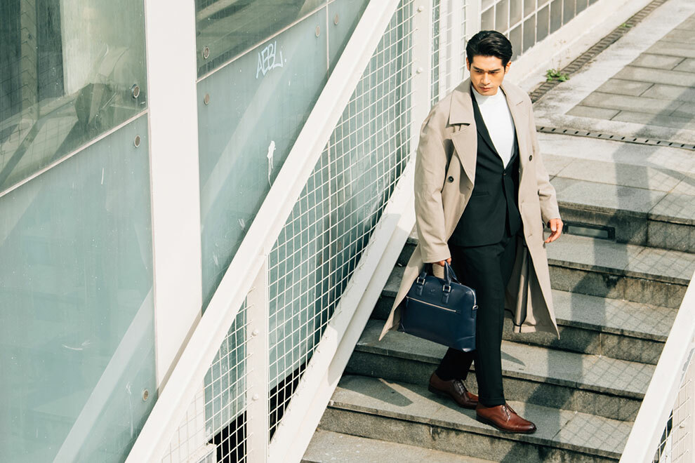 穿搭要顯得平衡,包件的大小也需要做配合。最恰當的尺寸,讓公事包不會顯得笨重,在服儀的搭配上也很適中。