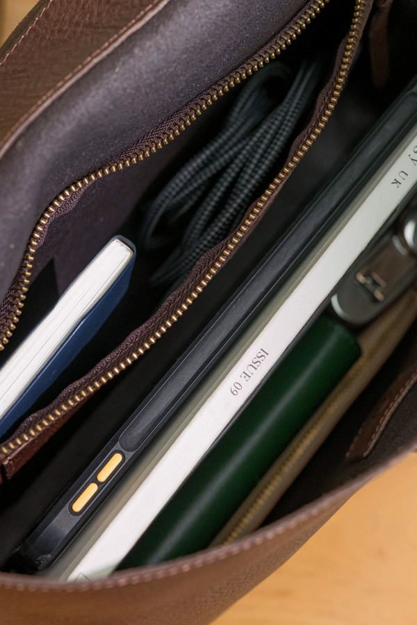 以半植鞣皮料呈現自然摔花紋理,再以簡潔的結構塑造輕鬆、耐看的休閒氣質;包身保留充足的收納層次,如內袋、隔層、筆電的位置等,滿足日常攜帶的實際需求。背帶則提供多種設計,透過不同長度與包蓋連結方式,展現截然不同的穿搭風格。