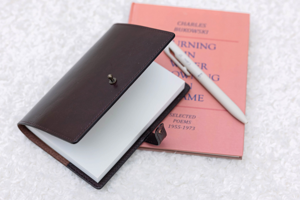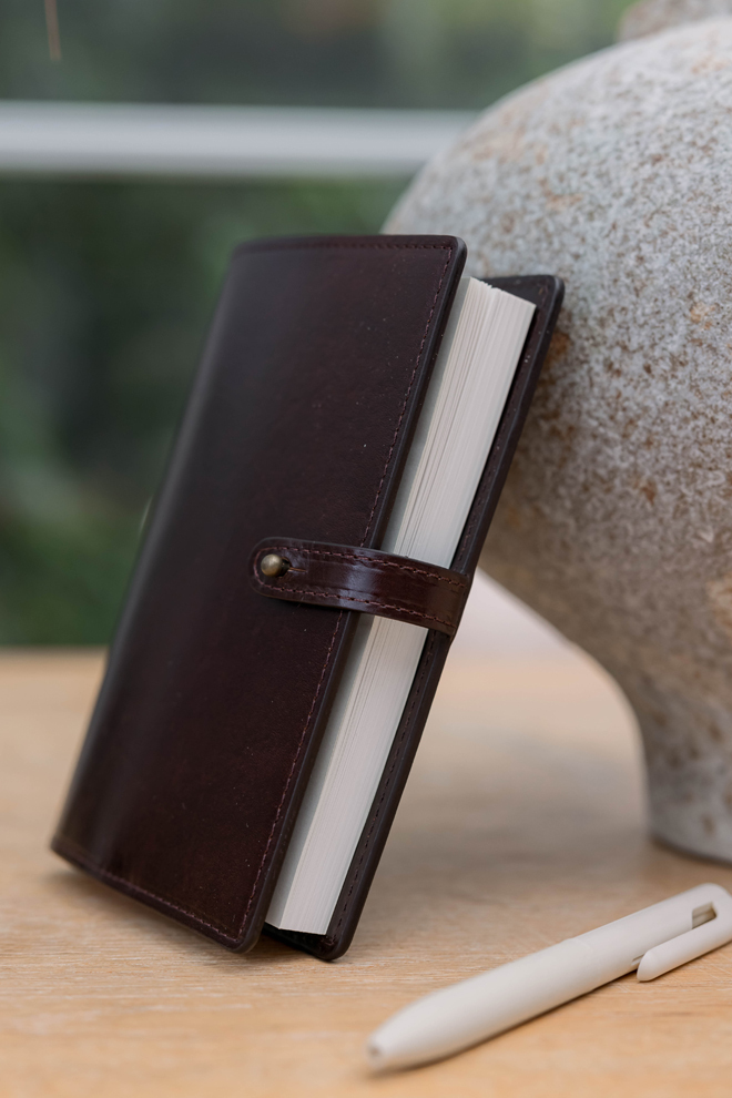 以植鞣皮革製作的皮革封套,隨著時間使用逐漸呈現獨特的光澤與溫潤手感,愈加具有個人風格。內附空白筆記本,提供純粹的創作與書寫空間,適合用於設計靈感、工作紀錄或日常筆記。