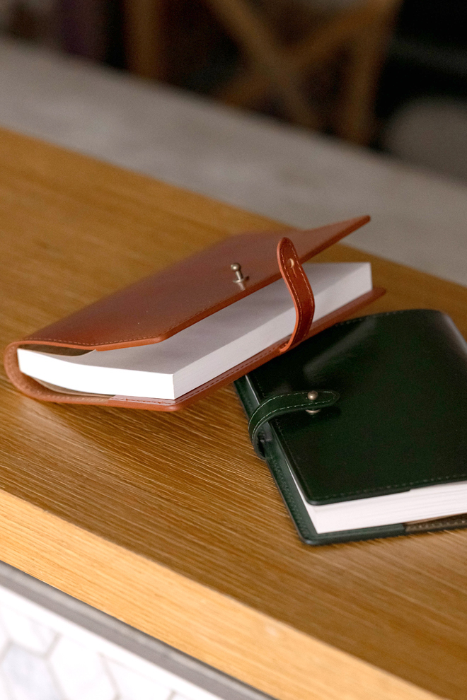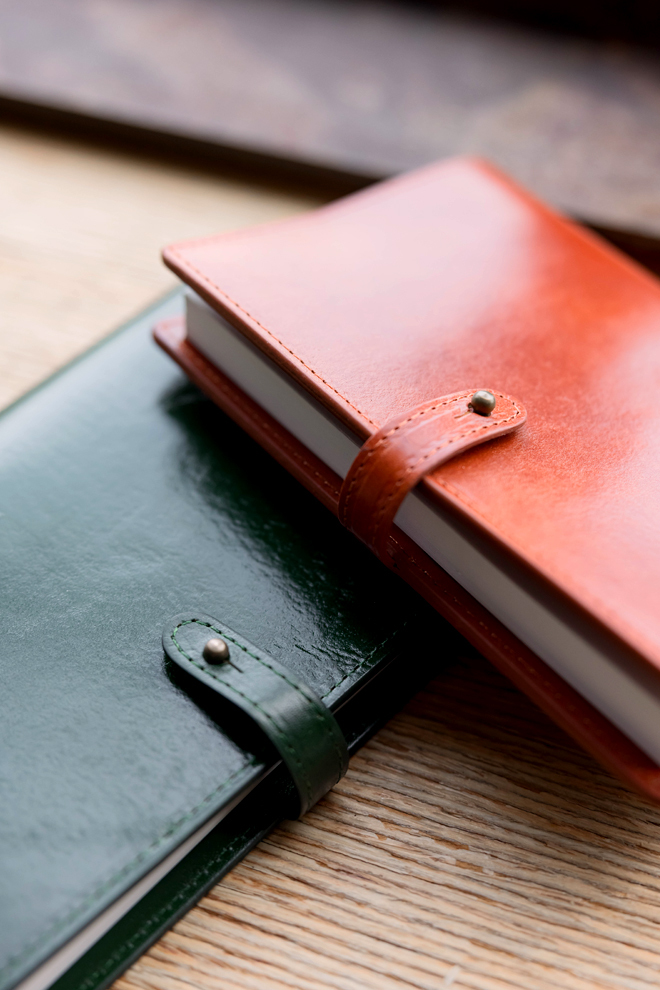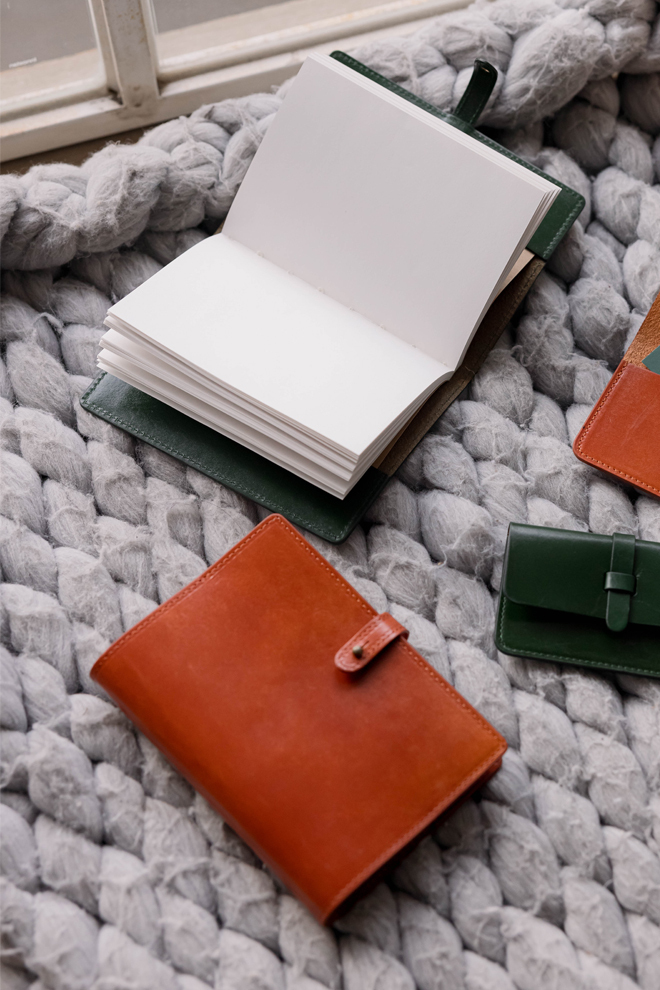 以植鞣皮革製作的皮革封套,隨著時間使用逐漸呈現獨特的光澤與溫潤手感,愈加具有個人風格。內附空白筆記本,提供純粹的創作與書寫空間,適合用於設計靈感、工作紀錄或日常筆記。