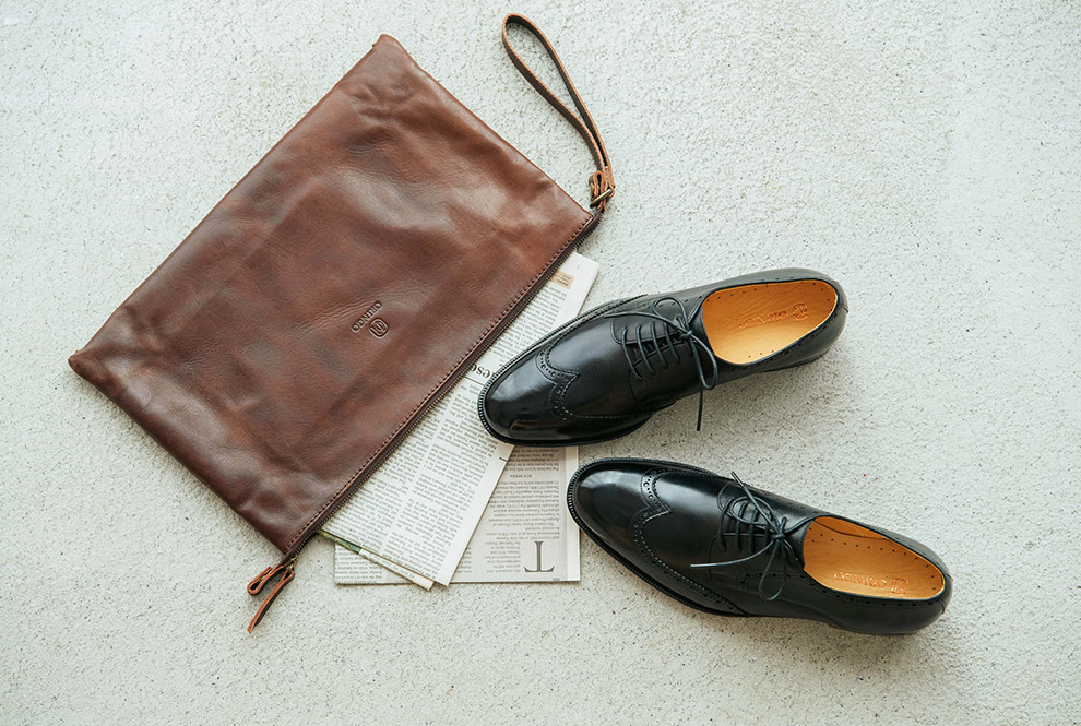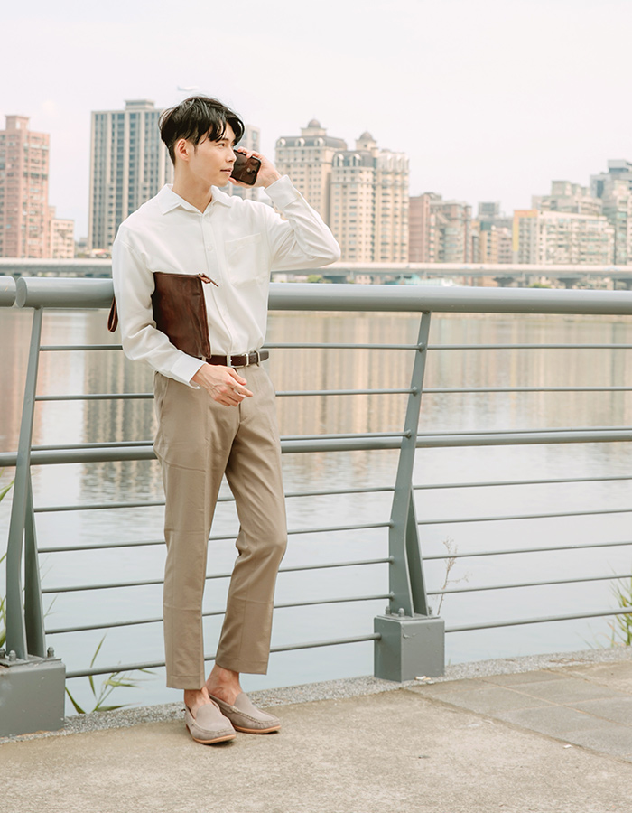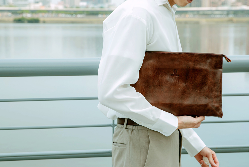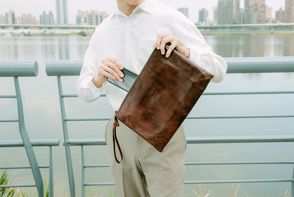 紳士皮件的延伸,手拿包不再專屬於女性,不只是受到名人效應的影響,越來越多男士使用手拿包,讓手機和票卡有更好的歸納,好看的牛仔褲或西裝褲再也不會有難看的線條。使用兩側壓釦可以變成大容量的盥洗收納包,兩種使用方式除了講求便利性之外,也讓生活變得更加簡單。