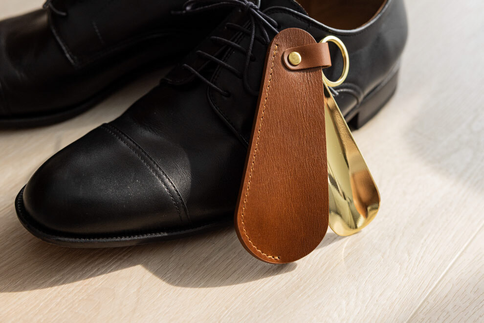 不同於一般常見的塑料或木紋材質,將皮革與鞋拔結合,正好呼應皮鞋的材質。