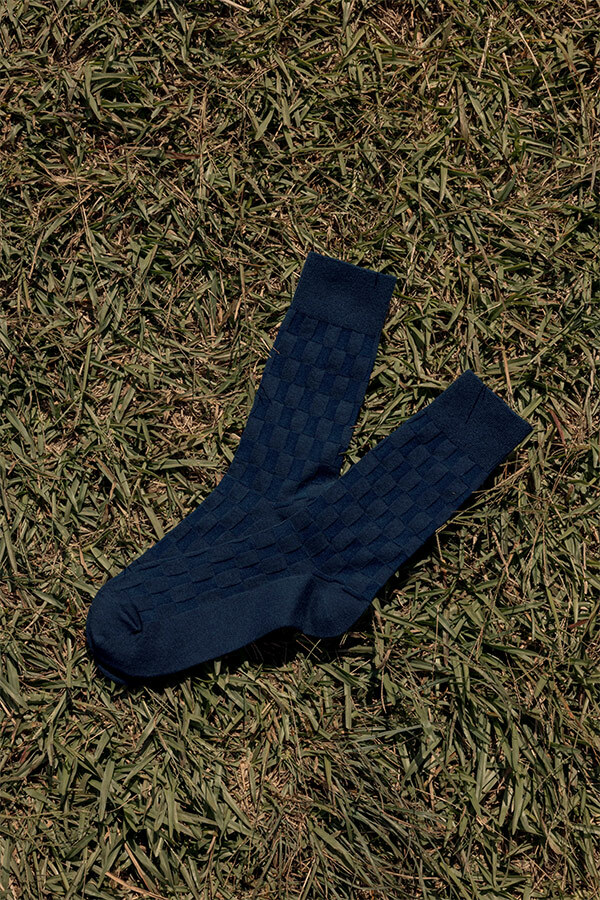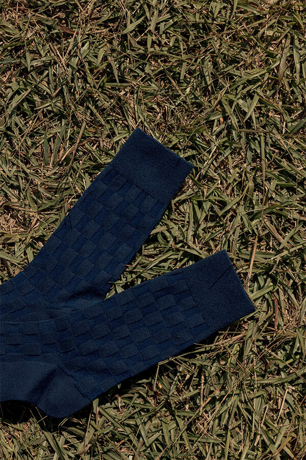 以棋盤格紋為基礎,以緹花的形式讓格紋相間用立體的方式呈現,同色是非常基本的設計,作為紳士襪十分出色。