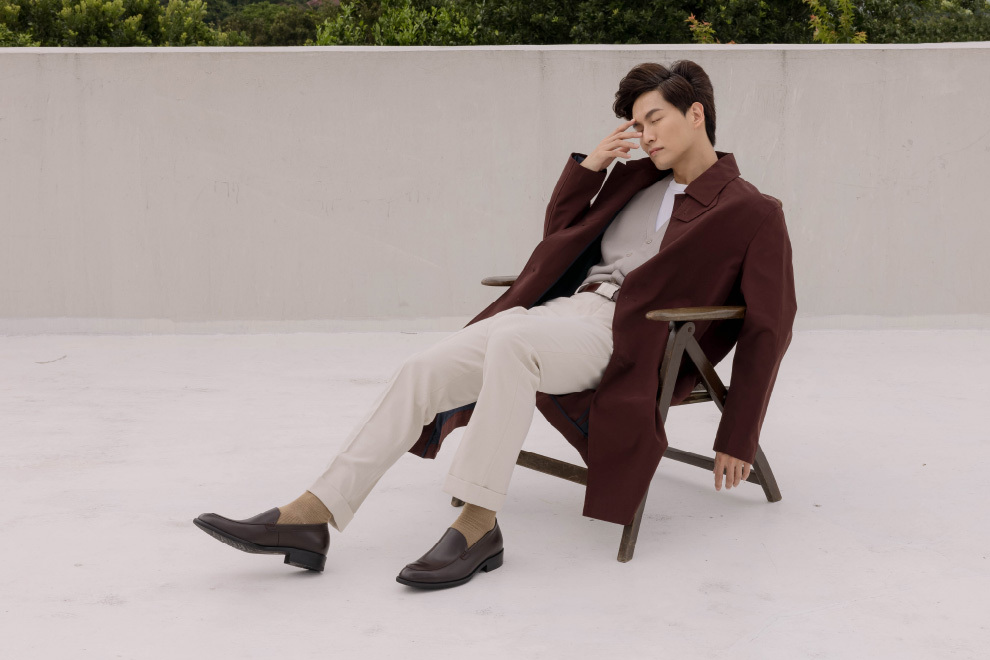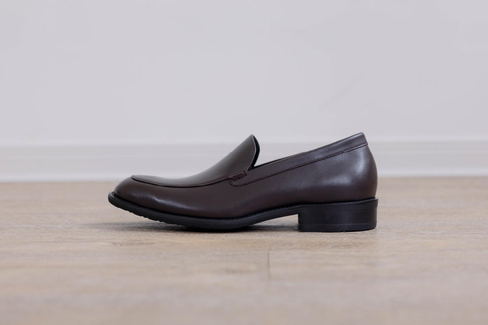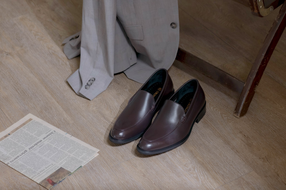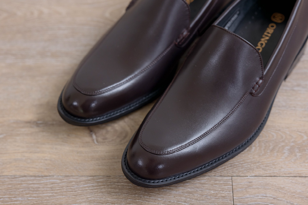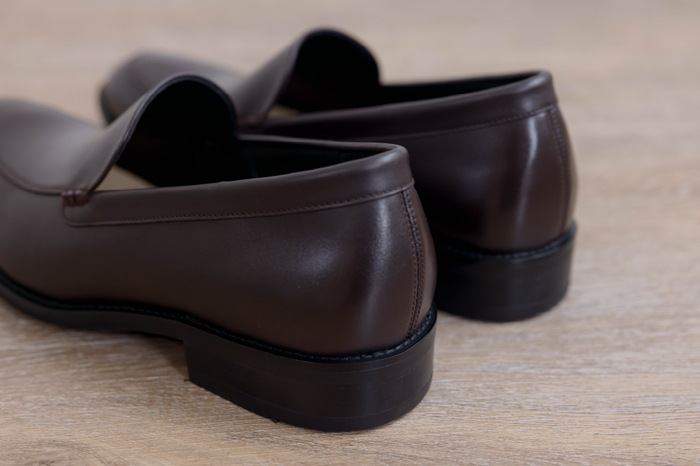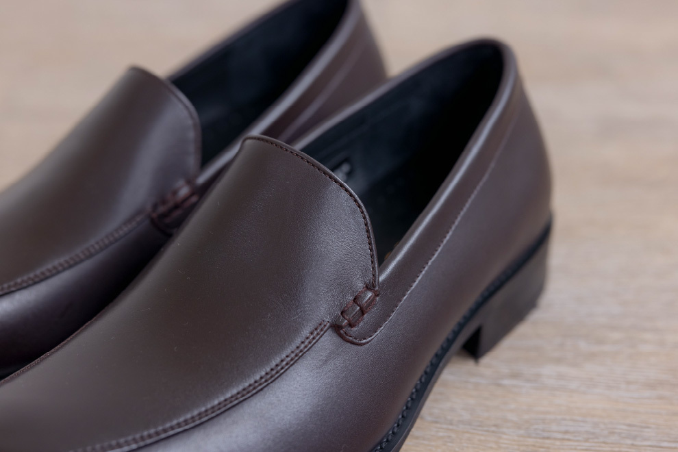 Slip on的定義為低筒無鞋帶的鞋子,最常見的款式稱為樂福鞋或拖鞋。鞋面以U-tip為概念設計,以雙車線的方式呈現,顯得細緻之外,還可以加強耐用性,讓鞋子接合更加牢固。側面的手縫馬克線細節,由於馬克線比較粗硬,更牢固美觀。使用皮革完整包覆鞋緣,穿著時不會因為行走摩擦而傷到足部。用一雙從上班到休假都適合穿著的皮鞋,在穿搭上做各種風格的詮釋。