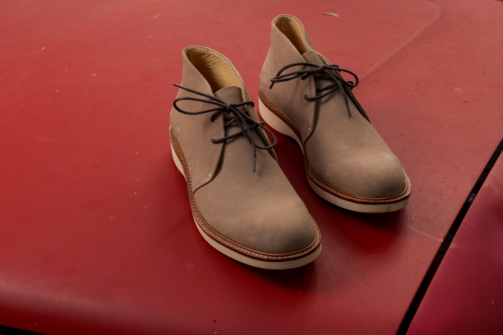 如今的沙漠靴依然保留著經典輪廓-柔軟麂皮或牛皮鞋面、簡約兩孔鞋帶設計、以及帶有對比色調的鞋底,延續著那份源自輕盈實用的軍事風格。
