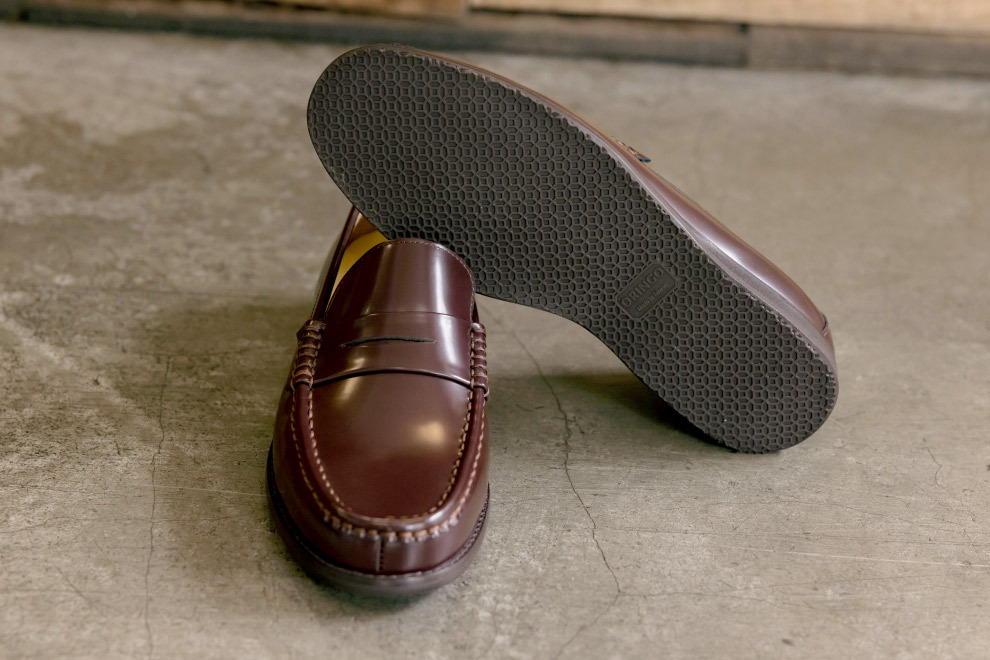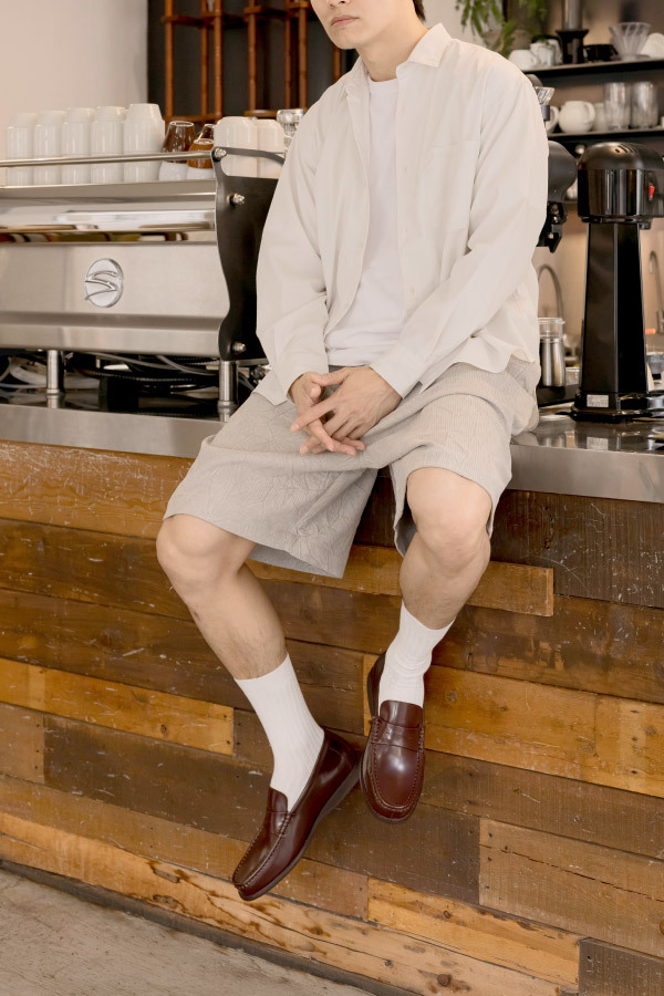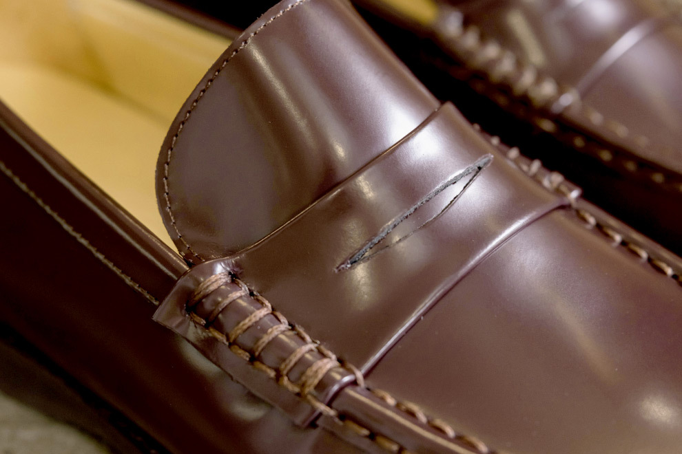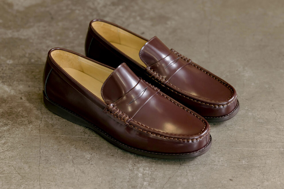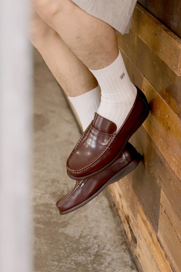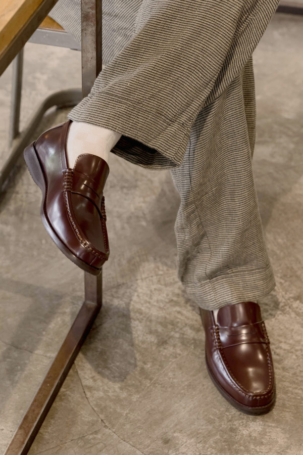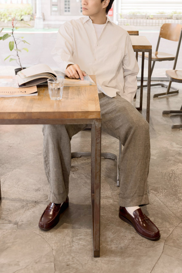 不需要在「正式皮鞋」與「休閒鞋」之間切換,樂福鞋從通勤、出差到日常外出,都能自然融入各種穿著情境。與傳統亮面皮革不同,Bookbinder 皮的光澤並不銳利,而是介於漆皮與霧面之間,帶有一層近似奶油的柔和反光。在觸感上,皮面平滑且具有彈性;在視覺上,幾乎看不見毛孔,同時具備不易附著髒污的特性,讓日常穿著更為輕鬆。
