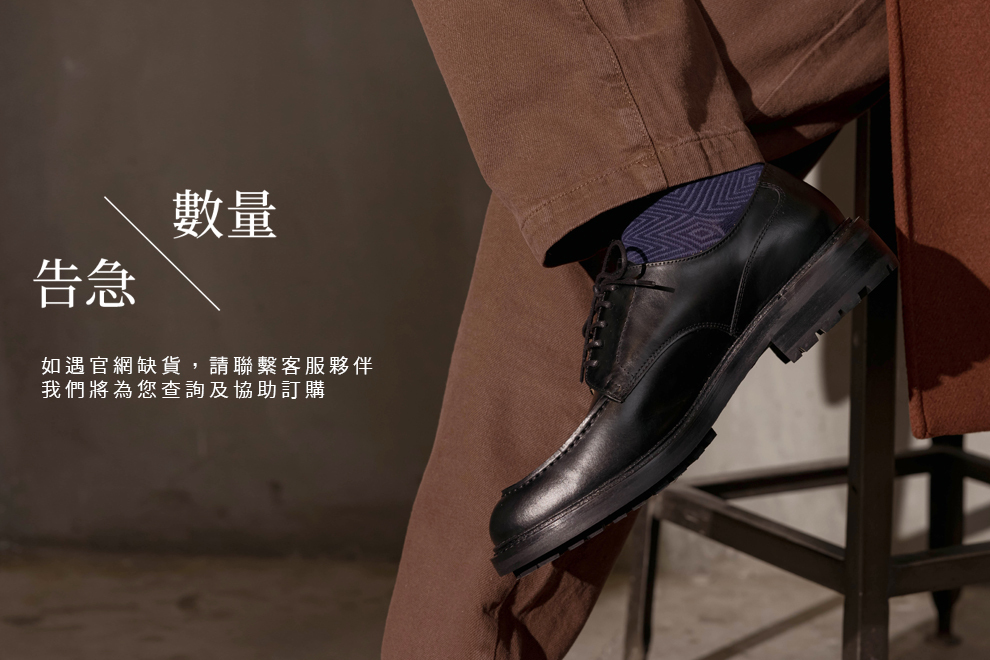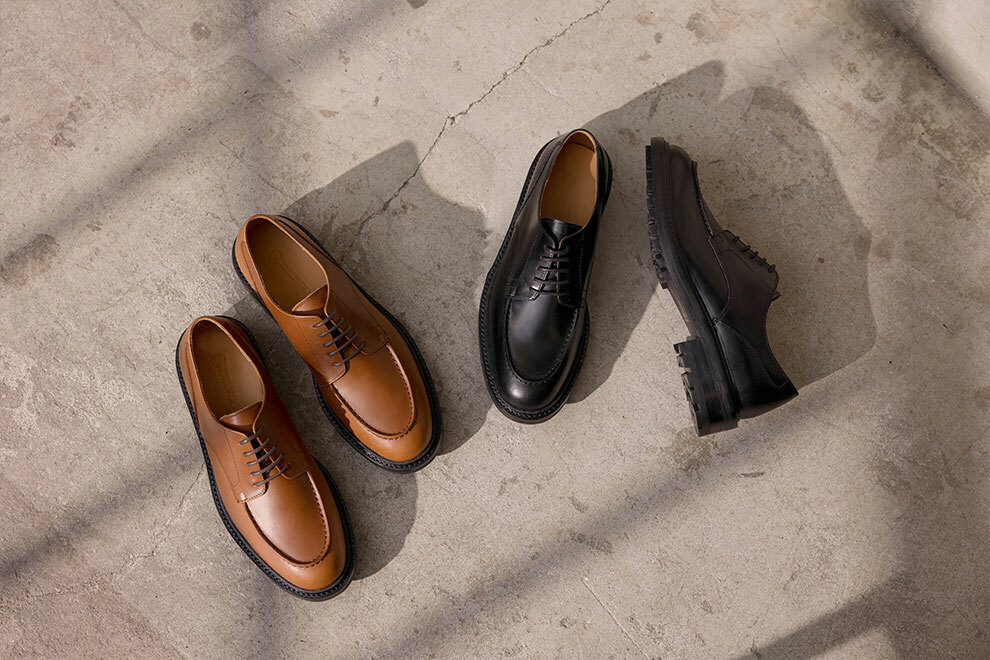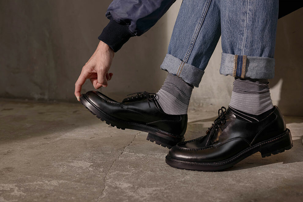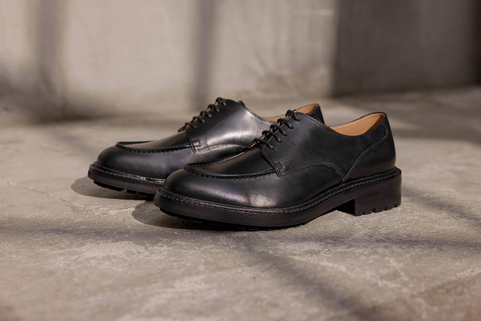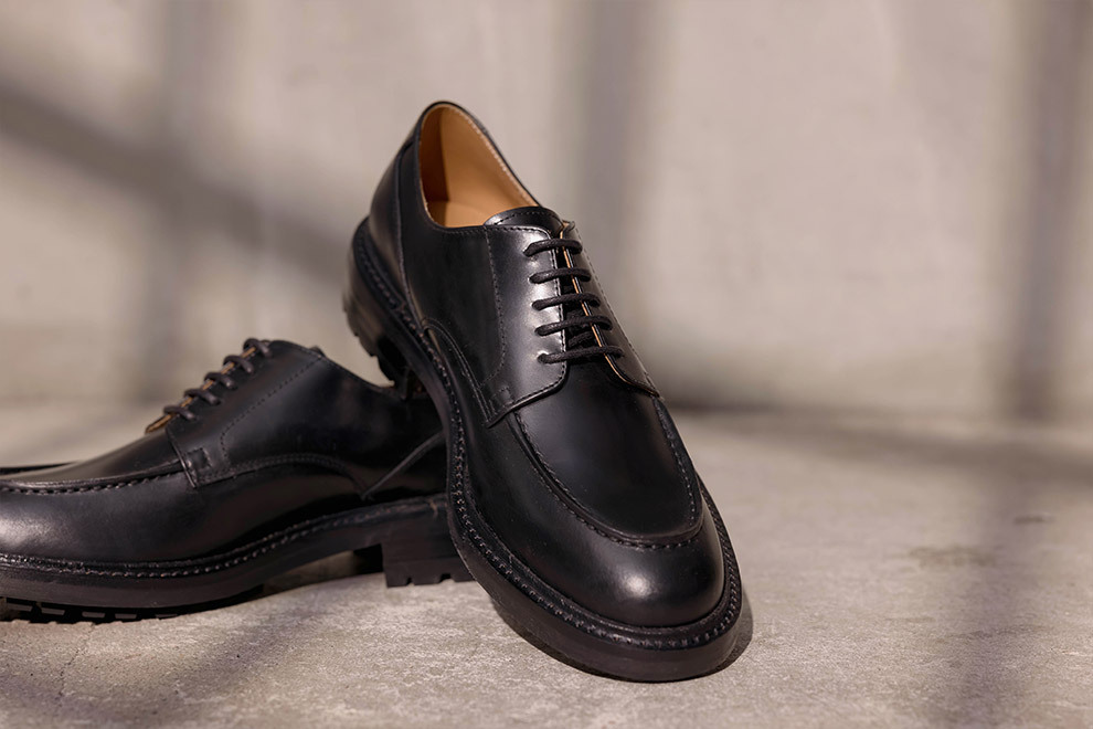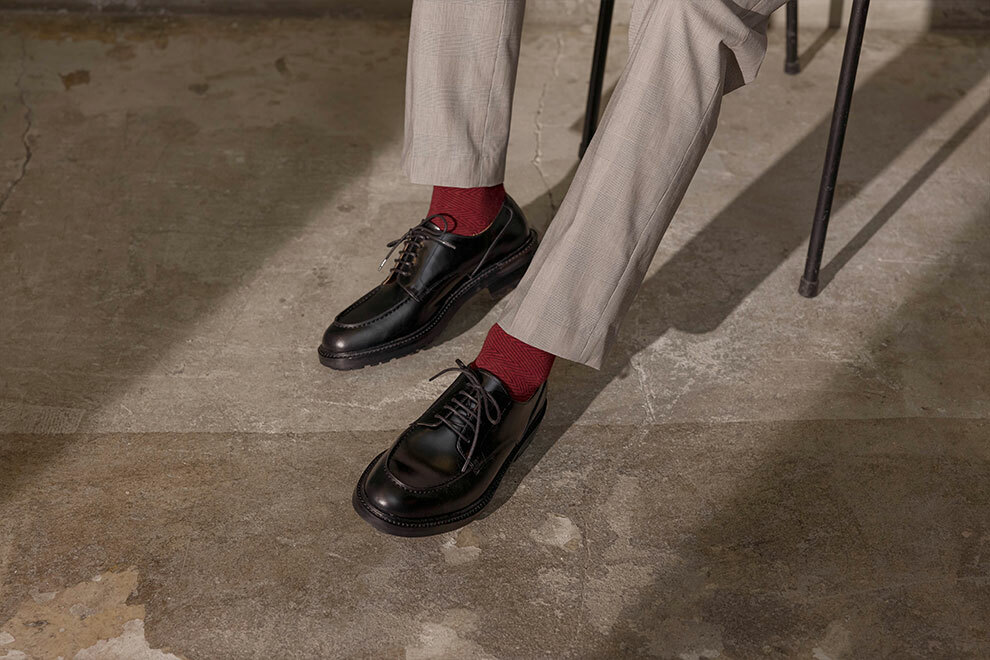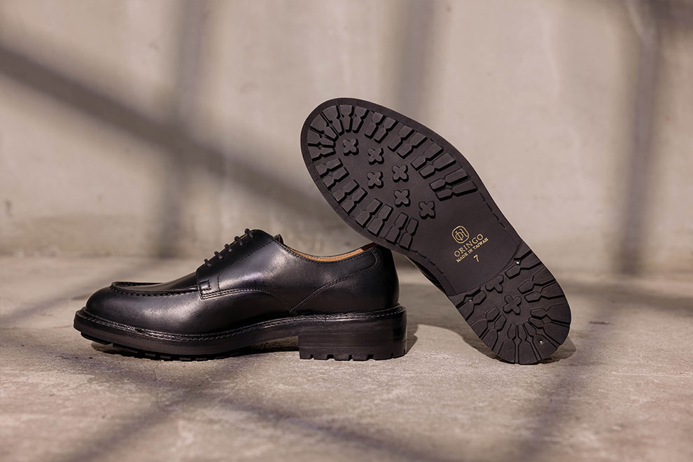 延續相同的楦頭與雷根大底,我們將經典的U-tip結合到皮鞋裡,打造出一款囊括休閒與商務的徳比鞋。全新開發的楦頭,休閒圓潤的鞋頭延伸到腰部展現「寬收到窄」,讓鞋型不會顯得笨重,反而多一分優雅。採用厚實的油感皮料,體現挺拔;後處理僅以鞋乳整雙皮面均勻拋塗,色澤自然且內斂。