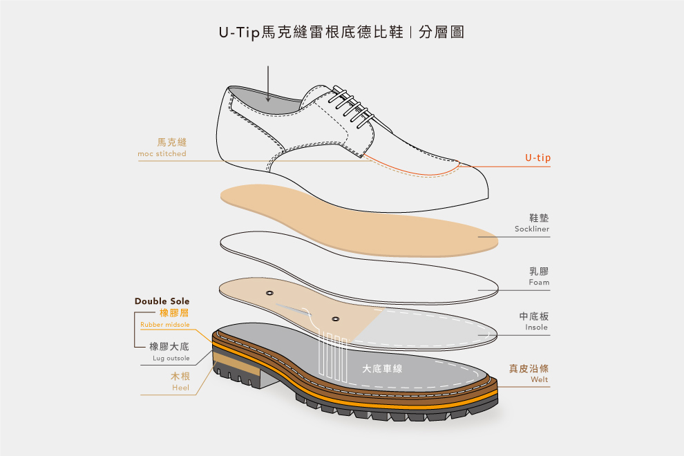 延續相同的楦頭與雷根大底,我們將經典的U-tip結合到皮鞋裡,打造出一款歷久不衰的徳比鞋。它在風格的呈現上囊括商務和日常休閒,甚至也能駕馭在工裝上,能夠多元性的使用,讓一雙鞋足以點亮你的每個生活美好時刻。