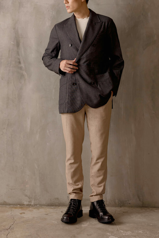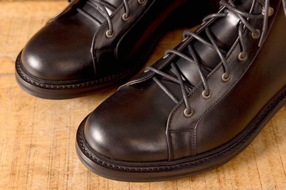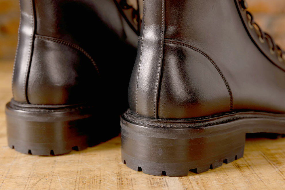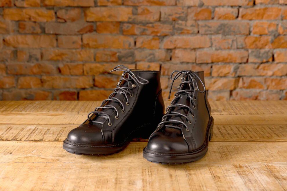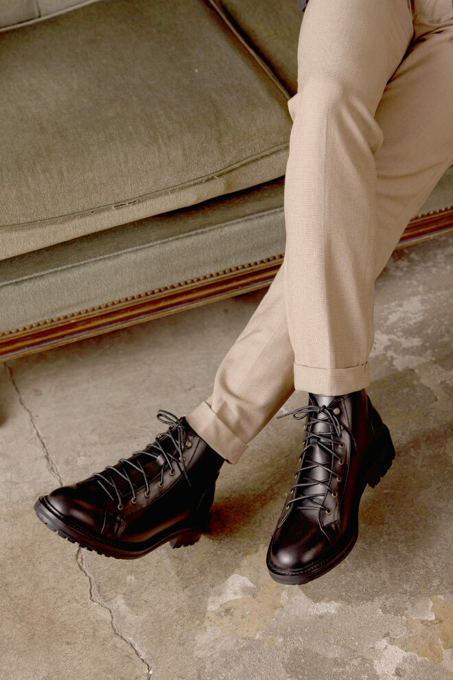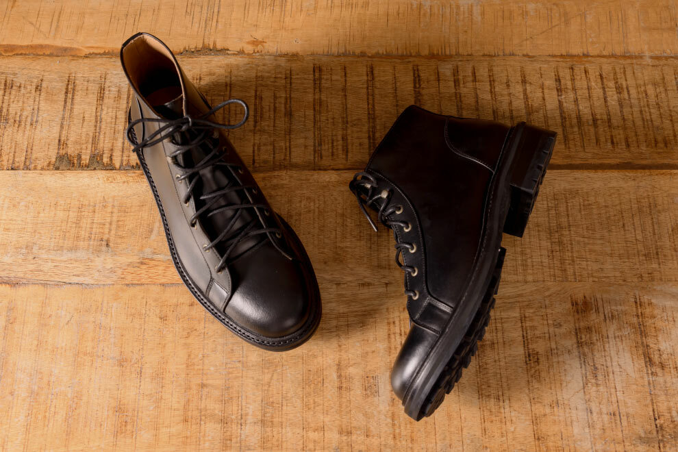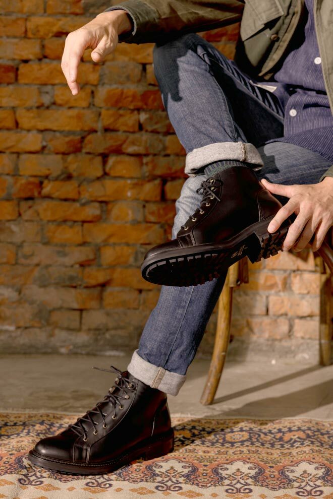 雷根底結構融合紳士皮鞋優雅線條,打造出深受年輕族群喜愛的俐落短靴版軍靴。設計團隊多次試穿調整高度,以適合亞洲男性比例,並特別增添虎骨釦設計,解決傳統靴款穿脫不便的問題。鞋面採用經典油感皮革搭配耐磨大底,細節融入配面色層皮,為造型增添硬朗而豐富的質感。