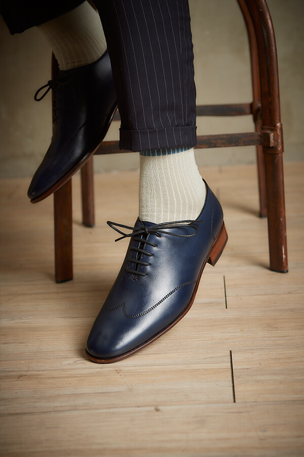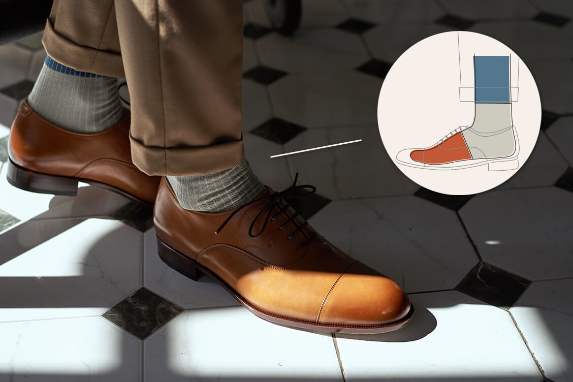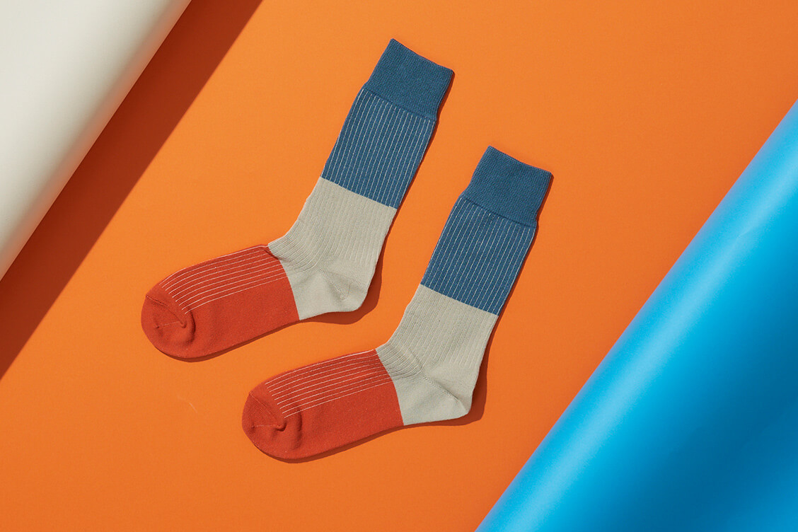 男士入門襪款的精彩撞色,羅紋織法的基本紋路搭上色塊拼接,創造出繽紛的視覺效果,利用襪子為西裝皮鞋穿搭創造細微低調的搭配巧思,是皮鞋穿搭時不可或缺的紳士襪選擇。