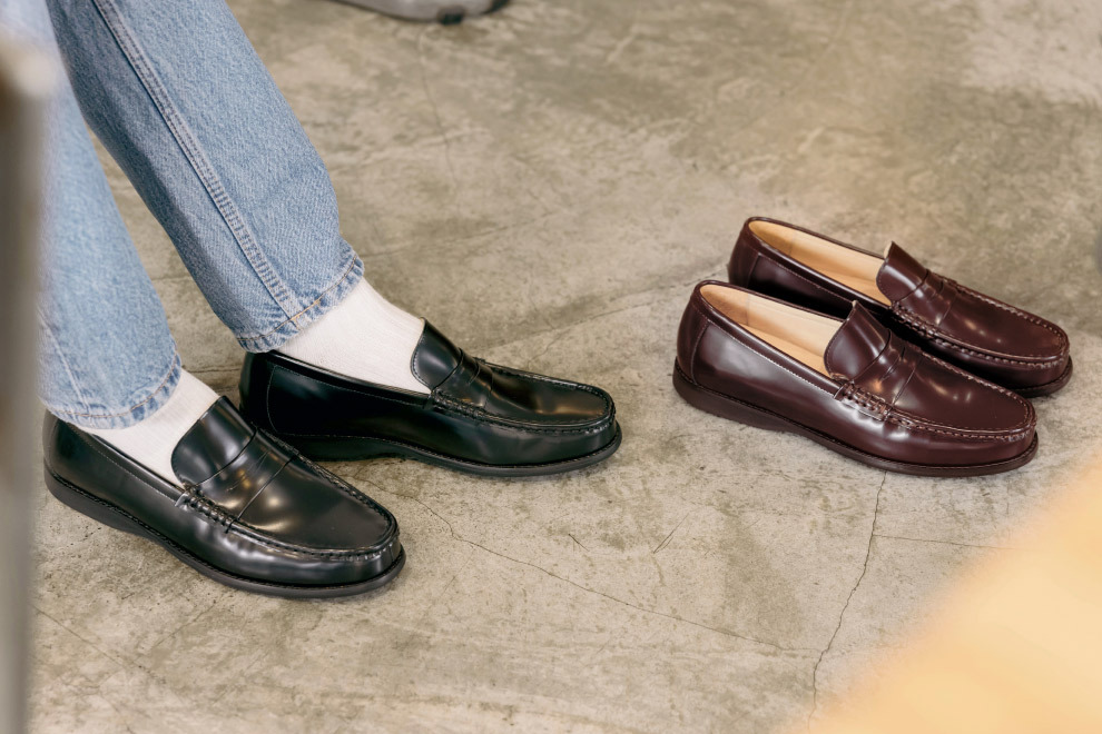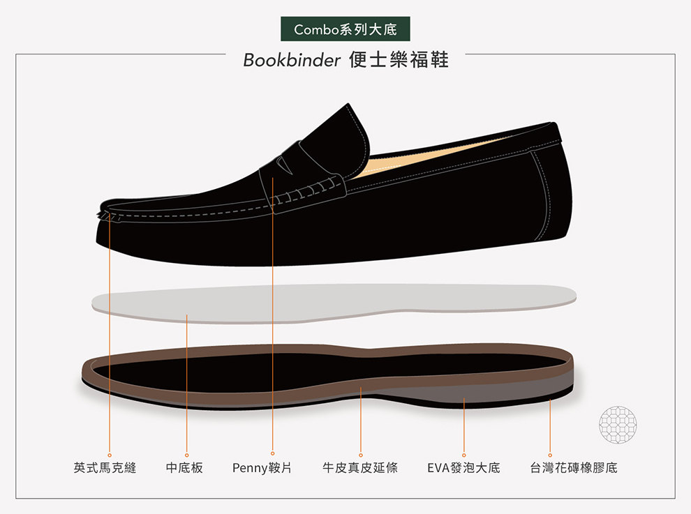 不需要在「正式皮鞋」與「休閒鞋」之間切換,樂福鞋從通勤、出差到日常外出,都能自然融入各種穿著情境。與傳統亮面皮革不同,Bookbinder 皮的光澤並不銳利,而是介於漆皮與霧面之間,帶有一層近似奶油的柔和反光。在觸感上,皮面平滑且具有彈性;在視覺上,幾乎看不見毛孔,同時具備不易附著髒污的特性,讓日常穿著更為輕鬆。